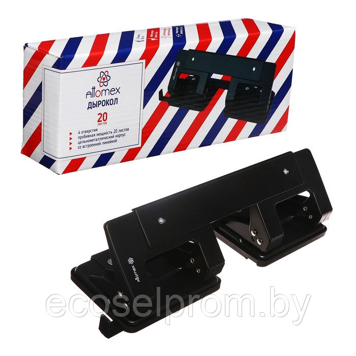Дырокол "Attomex" 4 отверстия (20 листов) металлический, со встроенной линейкой, черный, арт.4020008