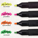 4 неоновых цвета в наборе: желтый, зеленый, оранжевый, розовый. Плоская форма корпуса диаметром 18 мм. Корпус тектовыделителя оснащен удобной зоной захвата. Скошенный наконечник имеет толщину линии письма от 1 до 4 мм, что обеспечивает удобство при работе с текстом, напечатанным мелким шрифтом, или таблицами. Текстовыделитель обладает экономным расходом чернил. Светоустойчивые чернила на водной основе не выцветают даже на открытом солнце и не размазываются в процессе использования. Изделие не перезаправляется. Колпачок с клипом и соответствует цвету чернил.