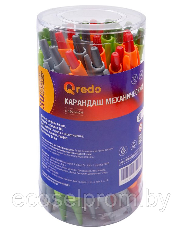 Карандаш механический Qredo совмесим с грифелями диаметром 0,5 мм. Твердость грифеля HB. Пластиковый корпус круглой формы имеет рифленую противоскользящую зону захвата, оснащен ластиком. Представлен в трех расцветках: салатовый, оранжевый, серый. В пластиковой тубе 30 штук. Широко используется школьниками, студентами и офисными работниками.