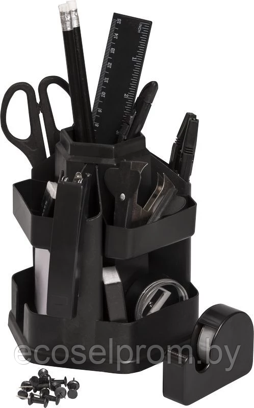Настольный набор-органайзер, 17 предметов (шариковая ручка - 2 шт., карандаш с ластиком - 2 шт., ножницы, нож, линейка, точилка, степлер №10, скобы №10 - 500 шт., скрепки, кнопки-гвоздики - 10 шт., клейкая лента в диспенсере, антистеплер, бумага для заметок, ластик, подставка), черный, вращающийся на 360 градусов.