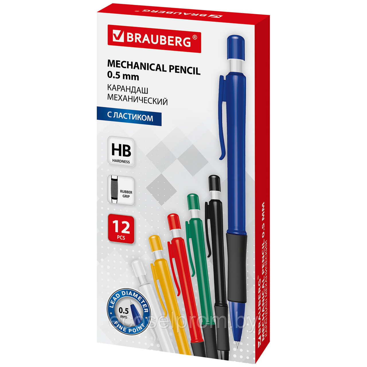 Механический карандаш BRAUBERG с корпусом ассорти и резиновым держателем в зоне захвата.
